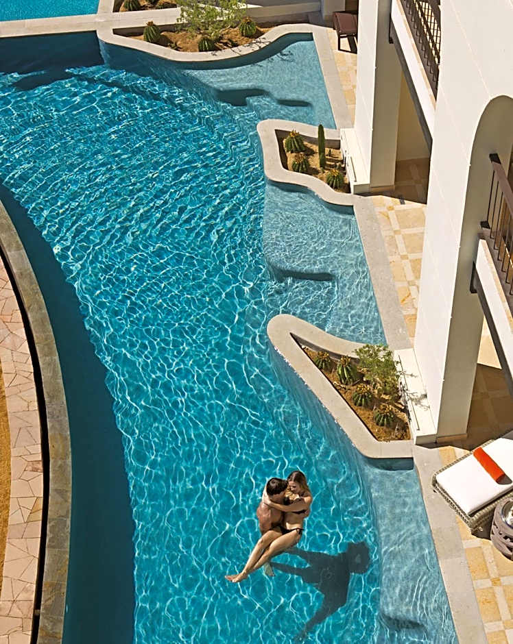 MASTER SUITE SWIM OUT is 1163 square feet and includes a king-size bed 150-183 width plus living room, terrace, desk, cable tv, hairdryer, tea and coffee making facilities , ironing set, safe, bathrobes, and slippers.